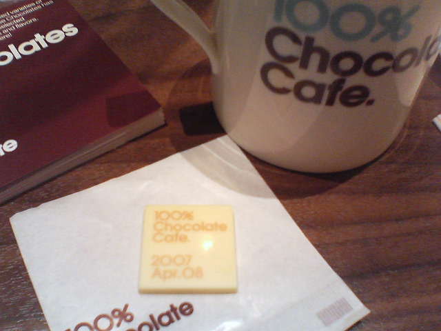 前々から気になっていた100%チョコレートカフェにやっと行くことができました。ドリンクを注文すると毎日違う種類のチョコがついてくる。今日のチョコはカスタードでした。ちょっと変わったものを期待したけど、いたって普通。ちょっと残念。食べようと思っていたワッフルもちょうど前の人で売れきれだったしー。