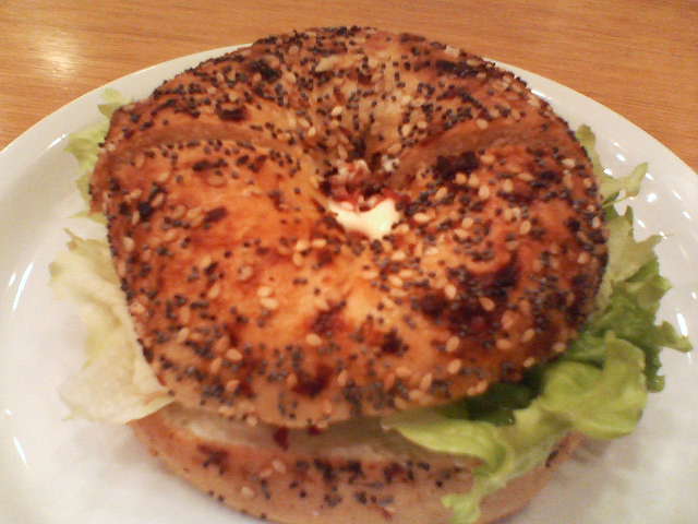 H&Hのベーグルサンド。ここのベーグルが結構好きです。オニオン、ポピーシード、セサミなどなどいろんな素材がいっぱい入っているエブリシングが一番のお気に入り。