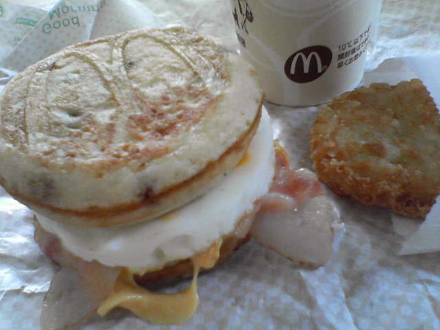 気になってたマックグリドル。説明できない朝ごはんてなんだ?とずっと気になってたので買ってきました!食べてびっくり!パンの部分がパンケーキでメイプルの味がする?!間にはさまってるものはたまごやベーコンなのに。どうなの、これ!私は普通のパンの方がいいかなぁ。